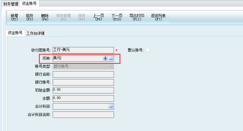 2、【財務(wù)管理】-【資金賬號】里面創(chuàng)建一個外幣賬號,選擇關(guān)聯(lián)幣種