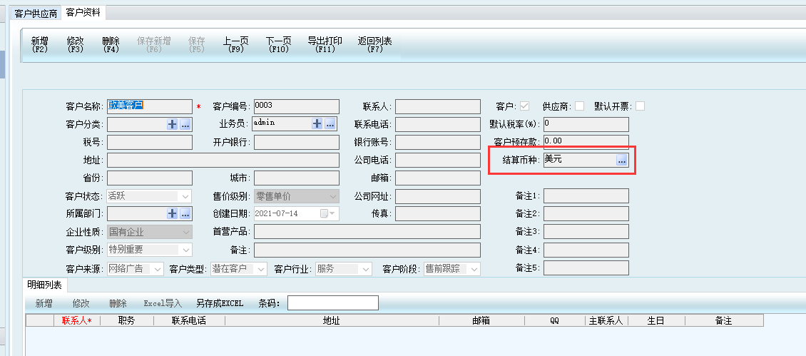 3、【客戶資料】里面給外幣客戶選擇對應(yīng)的幣種