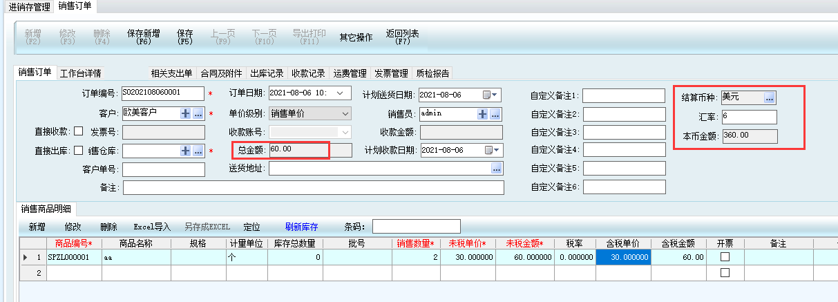 4、下達訂單時,訂單上選擇客戶后會自動帶出對應(yīng)的幣種,訂單上的單價輸入外幣單價,比如美元