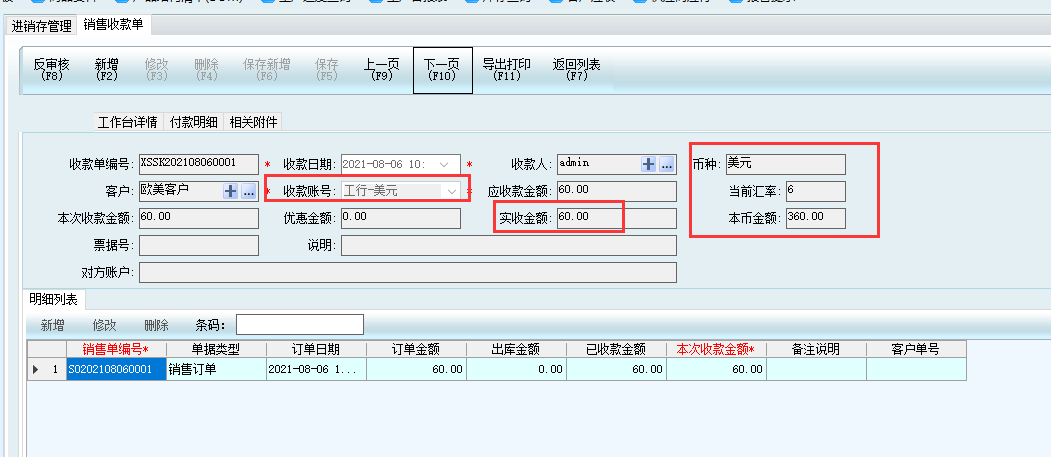 5、收到貨款時,在【進銷存管理】-【銷售收款單】里面做訂單收款,收款賬號選擇外幣資金賬號